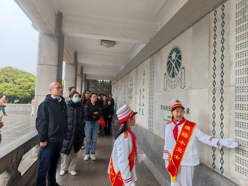 烈士陵園松柏靜哀、氣氛莊重,綿綿細雨中全體肅立,懷著沉重的心,默哀三分、敬獻鮮花。大家邁著緩慢的步伐繞塔一周,駐足瞻仰塔基上的場景浮雕,當年淮海戰(zhàn)役壯觀的場面和戰(zhàn)士們視死如歸的氣勢仿佛重現(xiàn)在眼前。在淮塔小衛(wèi)士的帶領(lǐng)和講解下,觀詳烈士名錄,懷想革命先輩們浴血奮戰(zhàn)的歷史,不無感嘆革命先烈英勇無畏的壯舉。嚴守紀律、團結(jié)奮戰(zhàn)、不怕犧牲、勇于奉獻的精神深深觸動著在場的每一個人。