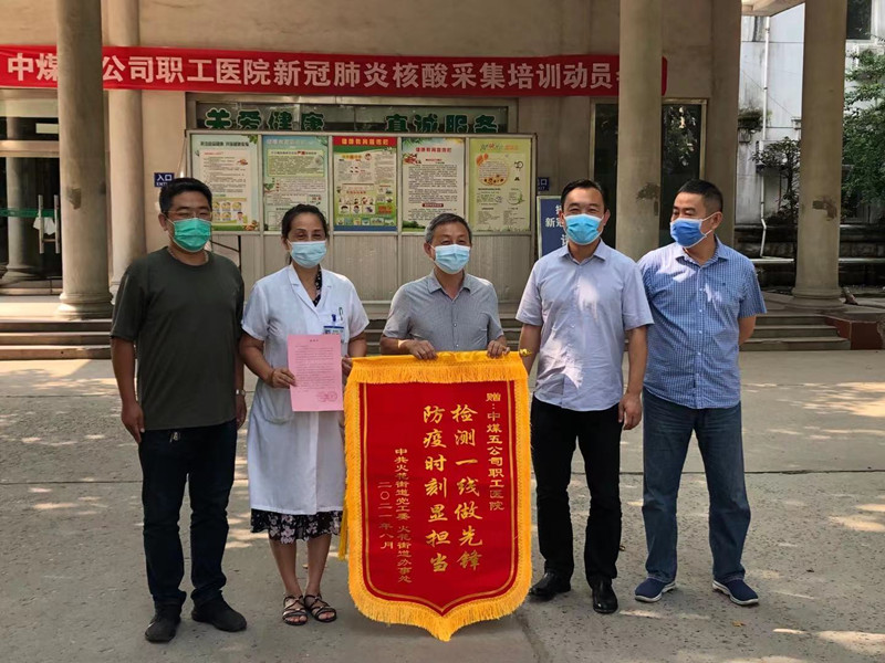8月19日上午,泉山區(qū)火花辦事處領(lǐng)導(dǎo)一行來到中煤五公司職工醫(yī)院,并送上感謝信和錦旗,表示“在中煤五公司職工醫(yī)院的大力支持和幫助下,街道在規(guī)定時間內(nèi)安全規(guī)范、高質(zhì)高效完成全員核酸檢測應(yīng)急演練工作?;茧y與共、同舟共濟得 真情我們銘記在心、身懷感激”。院黨委書記宋俊祥代表全院參戰(zhàn)職工接受感謝信和錦旗,并表示今后將一如既往支持街道辦事處工作,共同戰(zhàn)役、共擔使命。