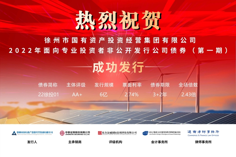 九、11月9日,徐州國投集團(tuán)2022年面向?qū)I(yè)投資者非公開發(fā)行公司債券(第一期)成功發(fā)行,募集資金規(guī)模6億元,期限為5(3+2)年,票面利率為2.74%。作為徐州國投集團(tuán)在資本市場上首次發(fā)行的債券,此次發(fā)行進(jìn)一步拓寬了公司的融資渠道,優(yōu)化了負(fù)債結(jié)構(gòu),降低了融資成本,邁出了從傳統(tǒng)融資方式向市場化融資方式轉(zhuǎn)變的關(guān)鍵一步,為后續(xù)在資本市場運(yùn)用其他融資工具奠定了良好基礎(chǔ)。