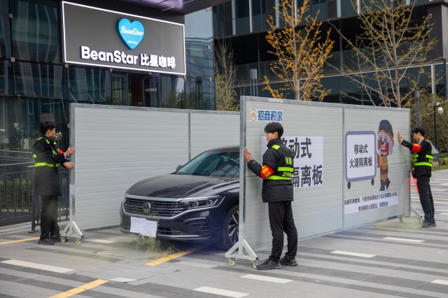 隨后,開始進(jìn)行新能源汽車自燃應(yīng)急處置演練,演練使用了招商積余物業(yè)針對新能源汽車自燃的專業(yè)滅火裝置,可以快速有效處置新能源汽車底部自燃情況。